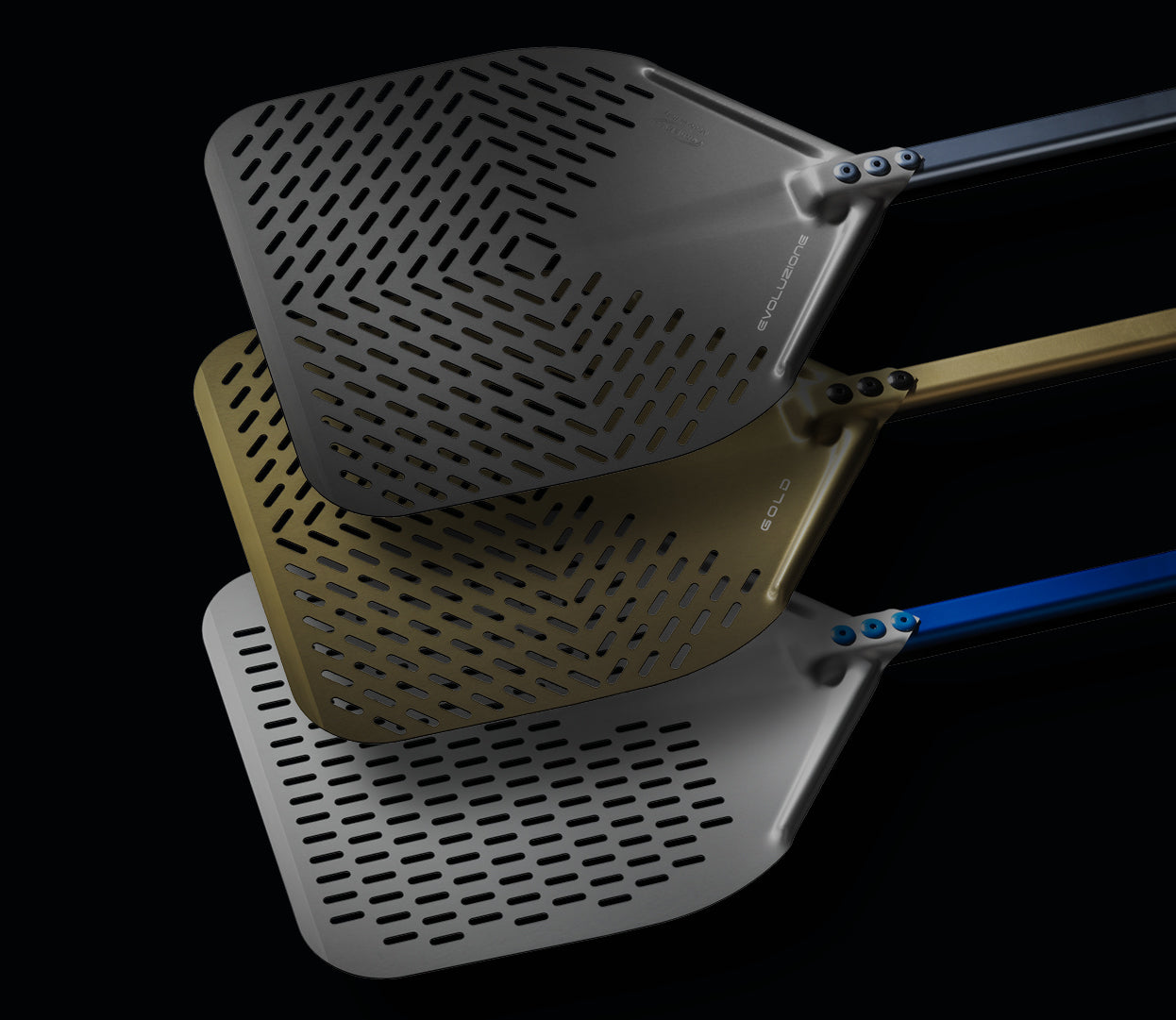 A seleção de pás para pizza perfuradas que permitem descarregar a farinha em excesso antes de enfornar a pizza.